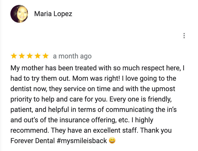 Patients like Maria Lopez love Forever Dental."My mother has been treated with so much respect here, I had to try them out. Mom was right! I love going to the dentist now, they service on time and with the upmost priority to help and care for you. Every one is friendly, patient, and helpful in terms of communicating the in’s and out’s of the insurance offering, etc. I highly recommend. They have an excellent staff. Thank you Forever Dental #mysmileisback 😃"